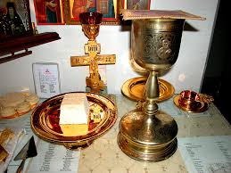 The Eucharist in the Byzantine Church doesn’t resemble what you may be used to receiving in the western Church. We use leavened bread, cut into particles in an elaborately symbolic rite which takes place immediately before the liturgy, usually privately observed by the priest at the side altar known as the Table of Preparation. These particles, once they are consecrated, are mingled with the Precious Blood in the chalice and distributed to the faithful on a golden spoon. The protocol is as follows: